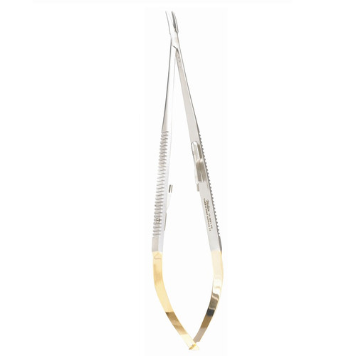 - A 7-inch, curved surgical instrument designed for precise suturing in cardiovascular and microvascular procedures, featuring durable tungsten carbide inserts